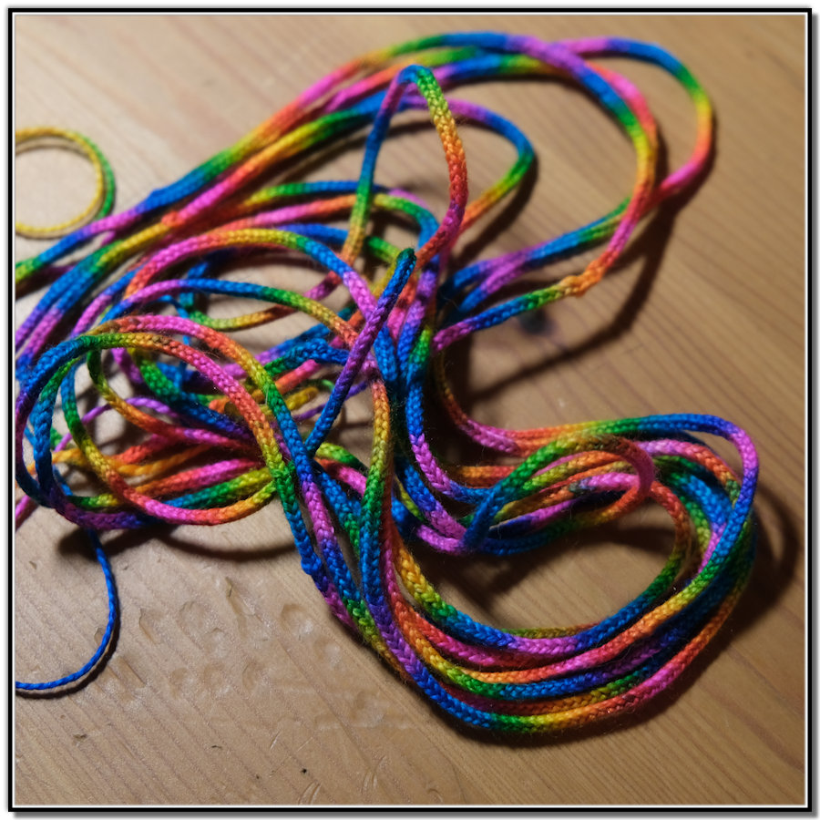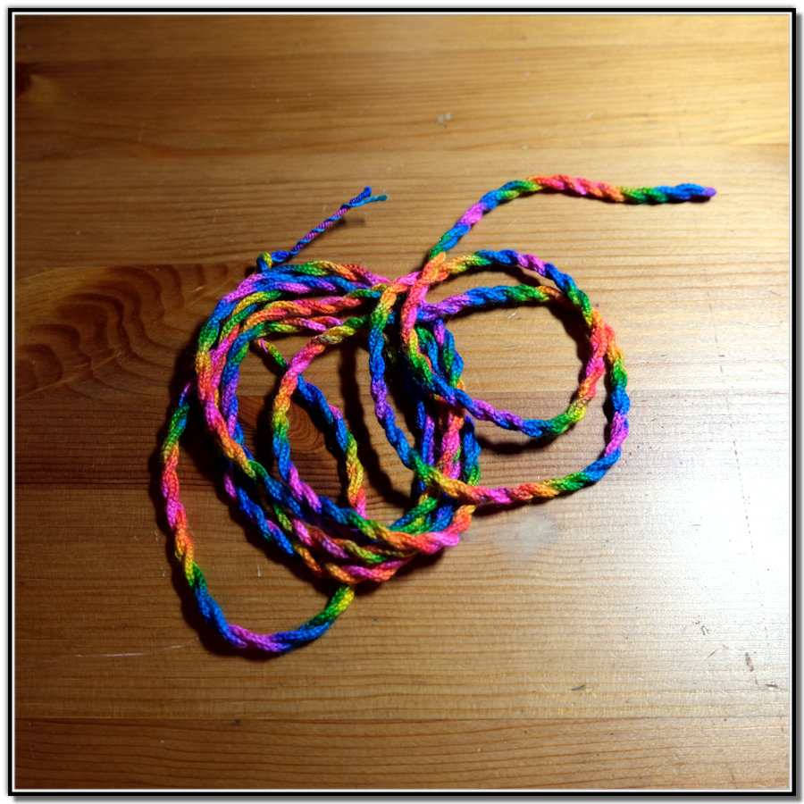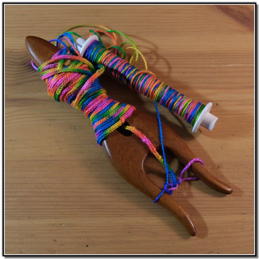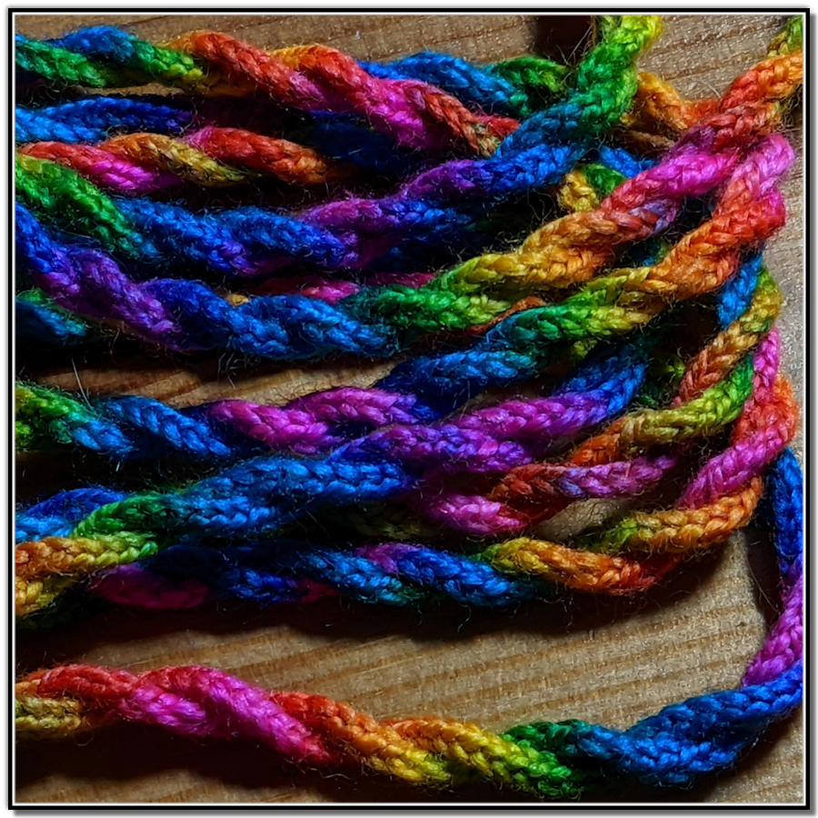 With a leftover bobbin from the most recent scarf weaving, I threw it at the lucet. The cord wove up beautifully. The long cord was twisted back on itself to make a colorful wool rope. I was surprised that the colors retained their space throughout all the steps.